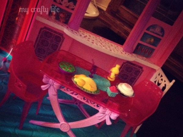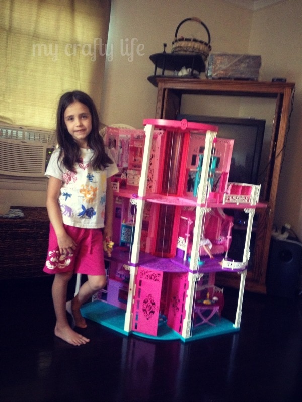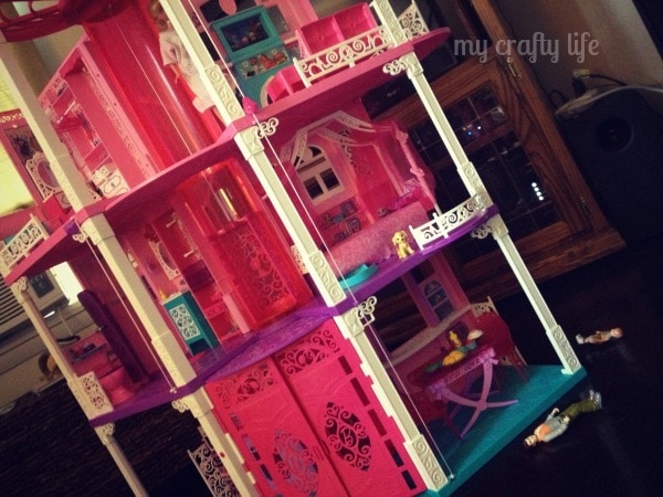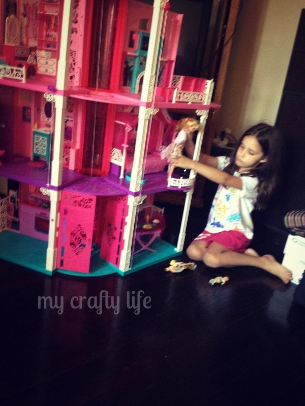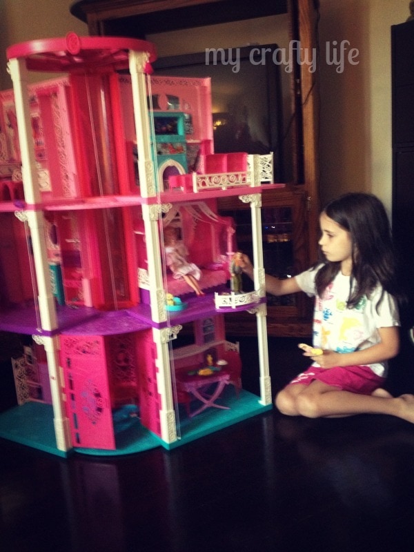 Ever since Lu, my six year found out that she was going to get to review her very own Barbie Dreamhouse she has literally asked me EVERYDAY when it was coming. We have never had the space for her to have her own. We just recently purchased a Saltbox (well midwest version) Cape where she has her own room and a loft area in the upstairs. I figured it was time for her to have one. True to form, her first worry was if the Princess Barbies were going to get along with the “regular” Barbies in the house. I assured her I thought it would be fine. 🙂 There’s room enough for all. Since the house has arrived Polly Pockets have had a sleepover as well as her dollhouse people (they were jealous that Barbie had a bigger house than them). I can report that all of them have gotten along fine.