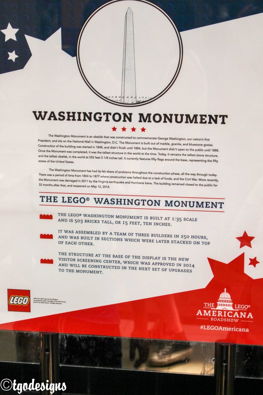 - The LEGO Washington Monument is built at 1:35 scale and is 503 bricks tall, or 15 feet, 10 inches