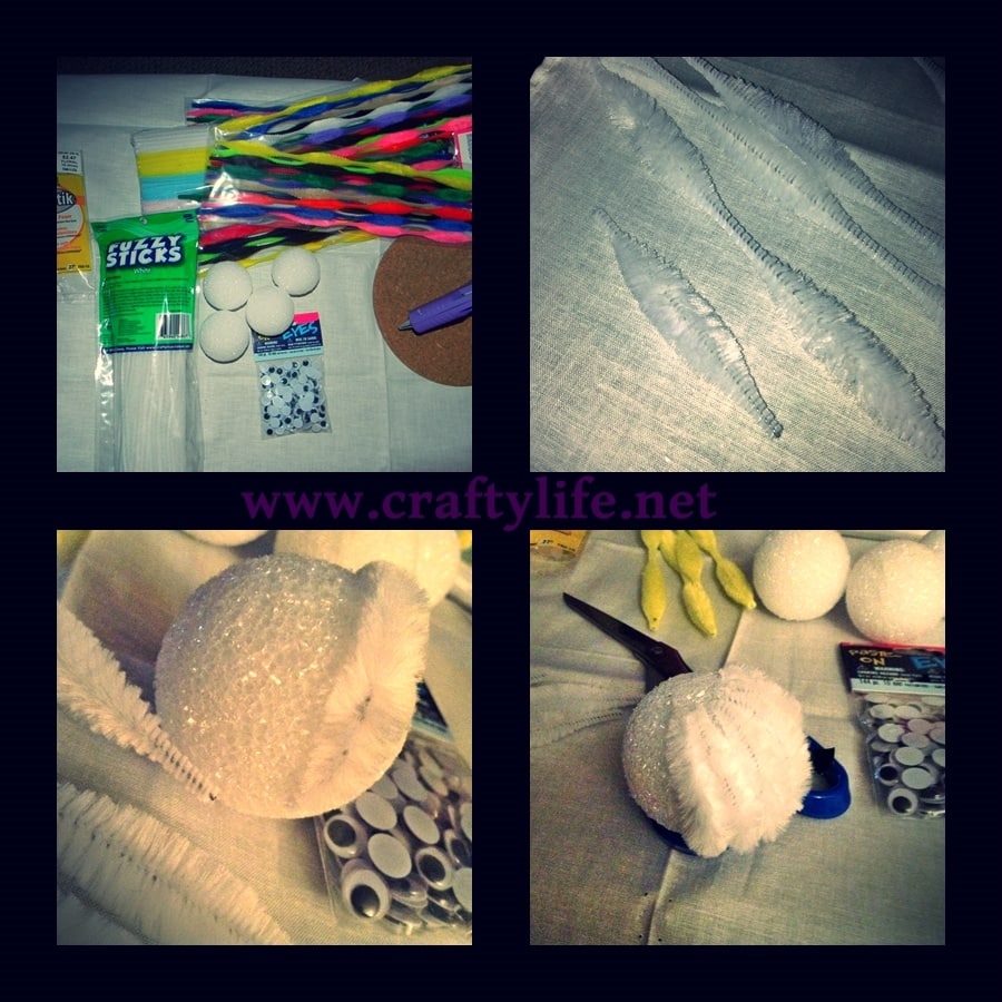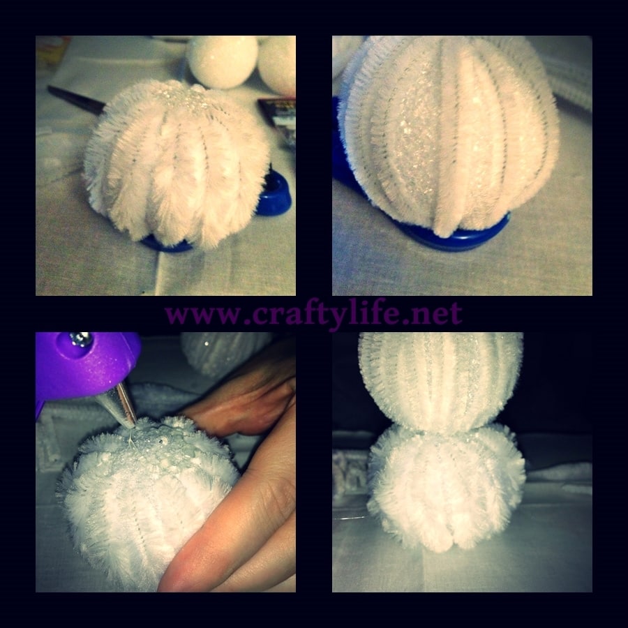 Start by separating all the chenille bumps stems by color. Take the white/yellow stems and cut in between each bump to make the bottom of the rabbit or chick. Pick a middle on the styrofoam ball and insert one end of the cut stem in that middle and stretch it to the opposite side and insert other end. Continue all the way around.