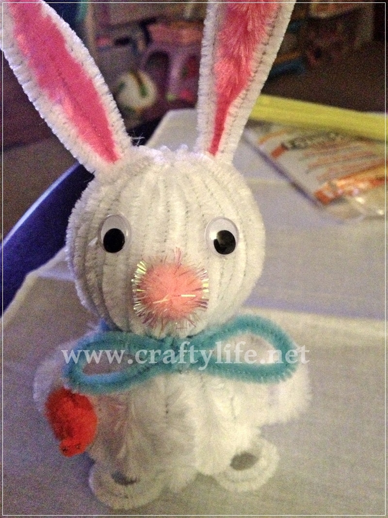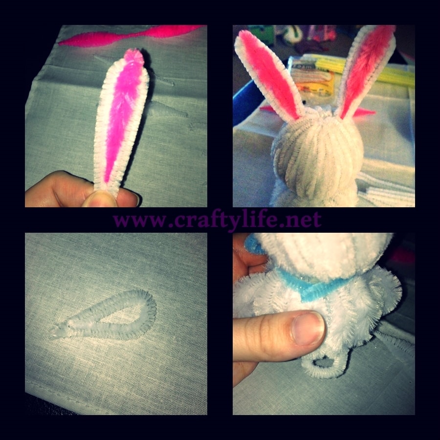 While you are waiting for the glue to dry make the bunnies ears. Take two chenille bumps (not cut) twist a single pink one in the middle of the two white bumps. Then twist the white bottoms together. Make two of these and stick them in the top of the head. Take two of the stems and make a c with them and stick them in the sides for the arms. To make the feet and the tail twist a regular pipe cleaner into a tear drop and stick two of them in front and one in the back.