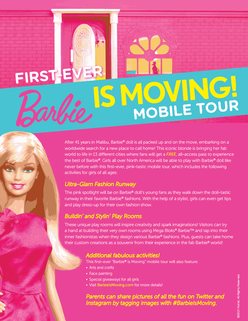 The Barbie Is Moving Mobile Tour is an all-access, free pass to the “best of” Barbie, including: