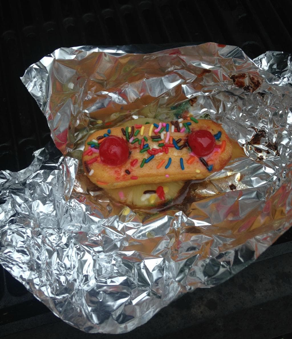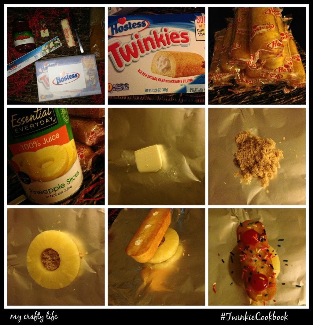- Start with a 4x4 section of tin foil. Place one pat of butter in the center of the foil. Sprinkle on tablespoon of brown sugar over the pat of butter. Place one slice of pineapple over the pat of butter. Place 1 unwrapped Twinkie over the top of the pineapple upside down. In each hole on the bottom of the Twinkie place one maraschino cherry. Wrap the tin foil into a packet and place on the grill (on low) for 3 minutes. After 3 minutes flip the packet over and cook for 2 more minutes. Take off the grill and let cool. Carefully unwrap the foil. You can add whip cream and sprinkles if desired with a additional maraschino cherry.