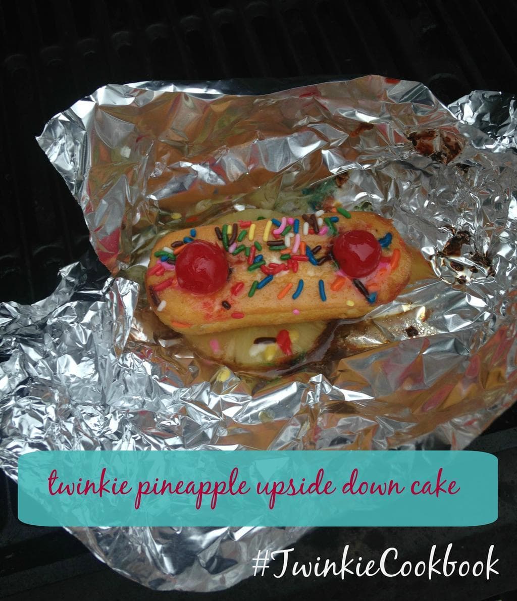 We make a dessert that all of us love. It’s easily adjusted and is awesome in just about any situation: Campfire Pineapple Upside Down Cake. You can make it in the oven, toaster oven, fire pit or grill. Admittedly my favorite is the fire or grill. I love the flavors. So when I was asked to create a recipe for the #TwinkiesCookbook it was a no brainer. I combined an iconic part of my childhood with a favorite dessert.