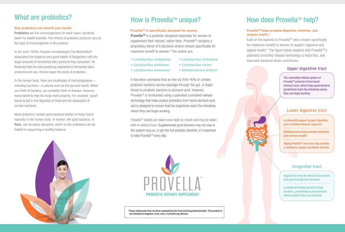 It has been estimated that as few as 20-40% of certain probiotic bacteria survive passage through the gut. Stomach acid is a major threat to probiotic survival.9 The patented controlled-release technology in Provella™ helps protect its good bacteria from harsh stomach acid and is designed to help ensure that active bacteria get to the intestines, where they can begin working.