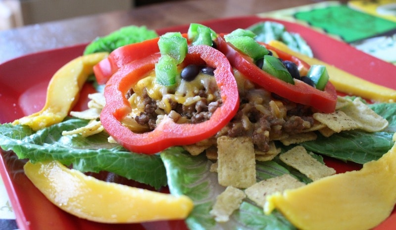 While the Hamburger Helper recipe was simmering, my husband and I chopped all the veggies, rinsed the beans plus prepared all the rest of the ingredients. The package didn’t come with enough corn chips for all of us to have in our salad instead of using it as a topping per the box’s directions, so we added a some of our own.