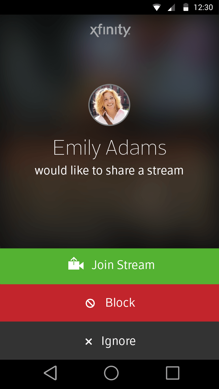 When someone you know wants to live stream video to your X1 DVR, you’ll receive an on-screen TV notification letting you know someone has sent you an invitation. You are then free to accept or reject, giving you complete freedom to watch it then or stay tuned in to your favorite shows.